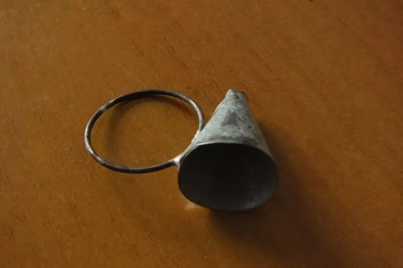 唔,关键武器是这个,汤子套。环戴在大拇指上,大的那头朝手心,用巧劲让面团从大头进小头出,汤子条就出来了。