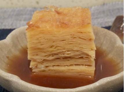 豆腐皮去硬边,在热卤汁中拖一下,叠七至八层后铺上一层用卤汁炒好的笋丝、菇丝,卷起包紧。入油煎上色再入卤汁中烧入味,晾凉后改刀食用。这是目前比较通用的一个方法,最早起源于杭州。最早据说是放在很浅的笼屉内用红糖熏制,但这一过程太繁琐,后来就改成先蒸后炸了。