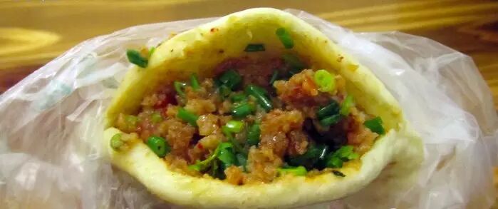 【闲话】非常有特点、好吃的粉蒸牛肉夹迷你白面锅魁。还可以吃那里的小笼粉蒸牛肉。 那个地址读作黉(hong2)门路。