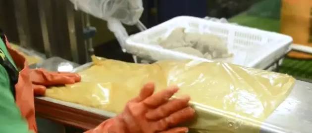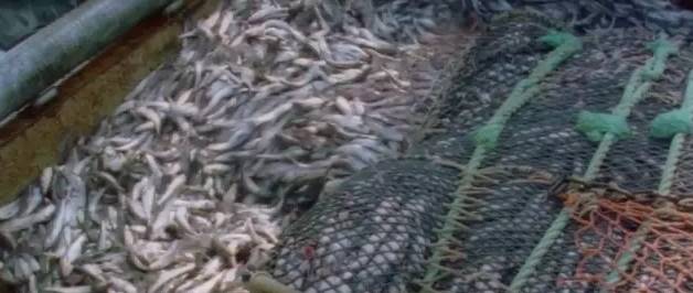 准备制作鱼糜。对于现代化加工船,这些步骤全部是机械化完成。被机器加工好的鱼糜会被冷冻至零下20度,以备后用。