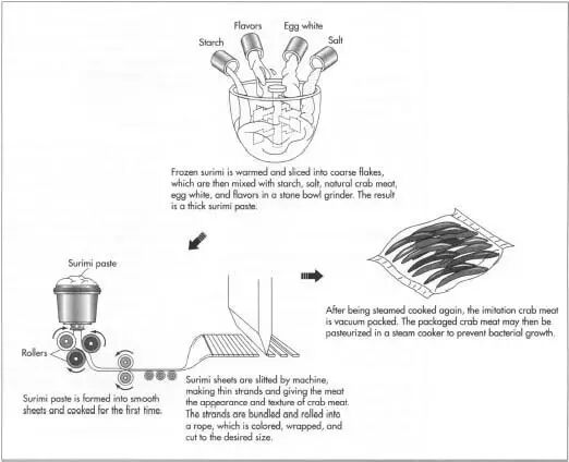 鱼糜首先会被加热升温至零下4度左右,以便切成薄皮。然后混合一定量的淀粉、盐等其他佐料。然后制作成型,就变成蟹棒了。