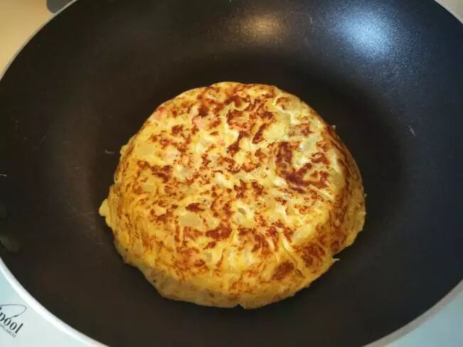 七、等最上面的鸡蛋凝固了,翻到平底锅里加热,避免底面加热过度,太焦
