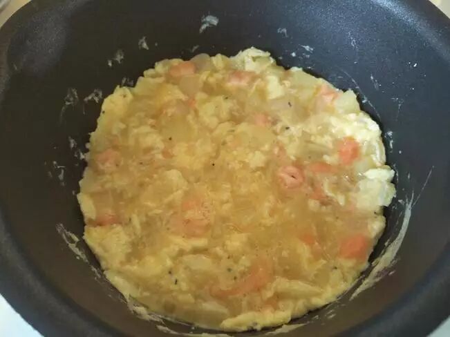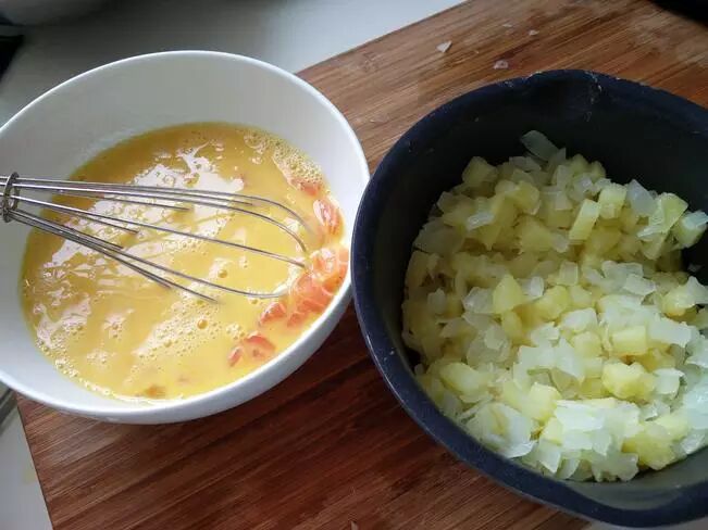 四、左边是蛋液加三文鱼,右边是炒软的土豆和洋葱