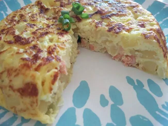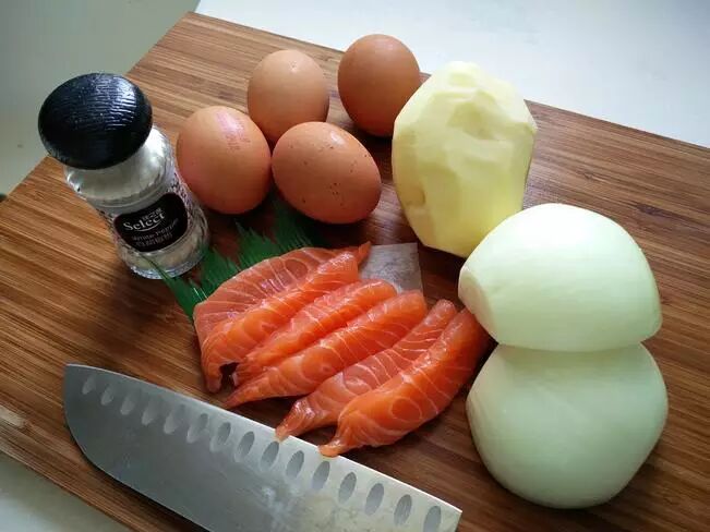 鸡蛋、洋葱、土豆、白胡椒、盐、油、三文鱼、帕玛森芝士碎、黑胡椒