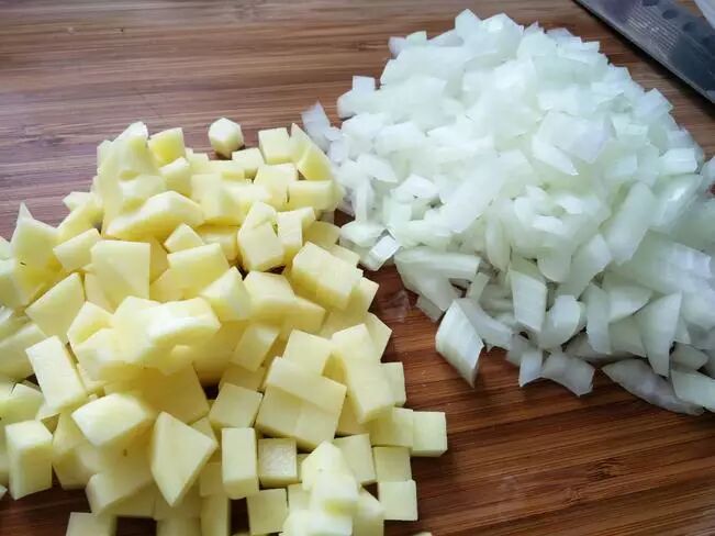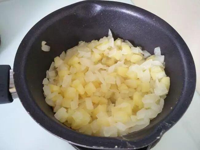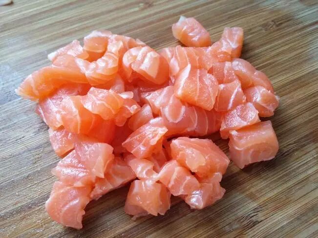 一、土豆、洋葱、三文鱼都切成小块备用