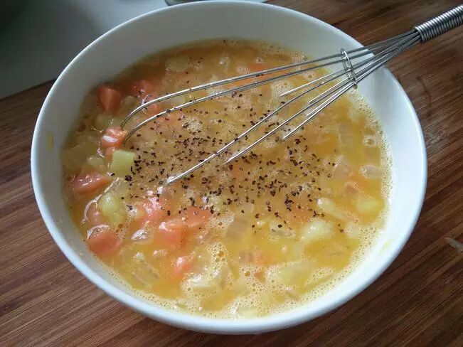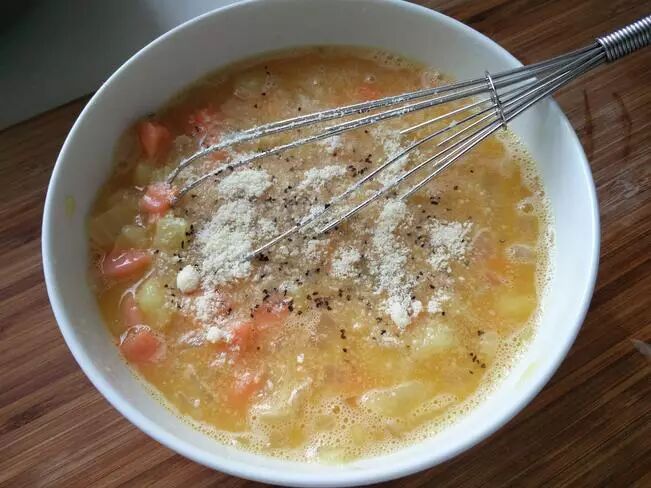 五、把土豆和洋葱混合到蛋液里,加白胡椒、盐、黑胡椒、芝士碎,搅拌均匀
