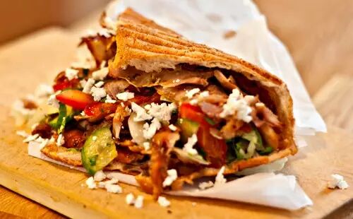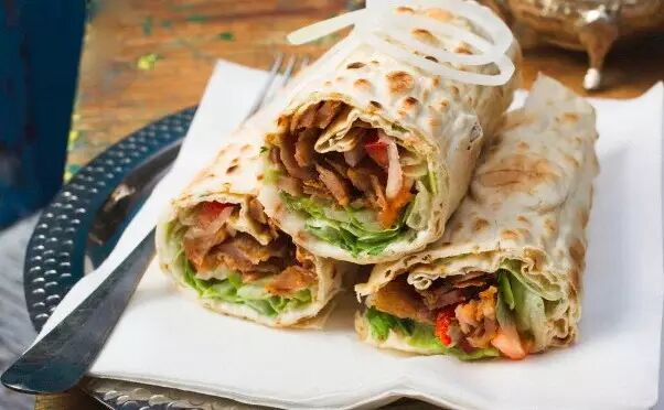 或者用没有发酵的面饼卷起来,这个好像叫Durum kebab,可以叫做土耳其烤肉卷吧。