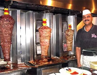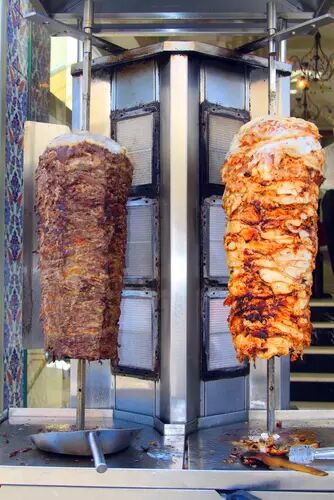 一根柱子上,一层层的羊肉,或者鸡肉,或者牛肉叠加上去,然后柱子旋转着,后边有热管慢慢把肉烤熟。