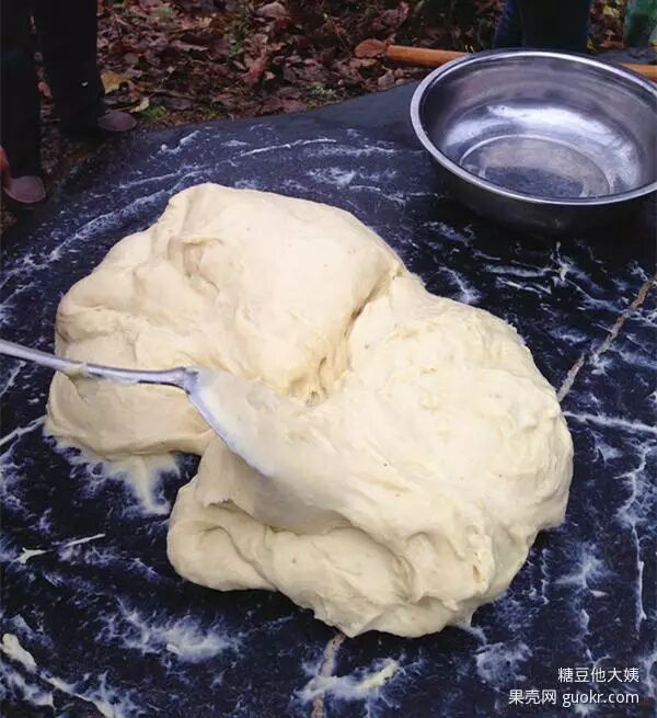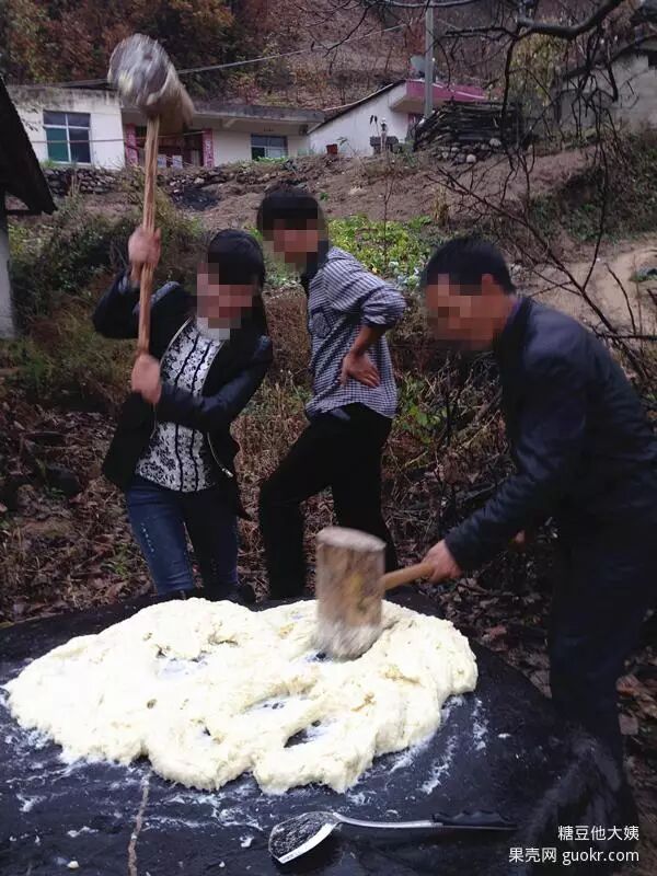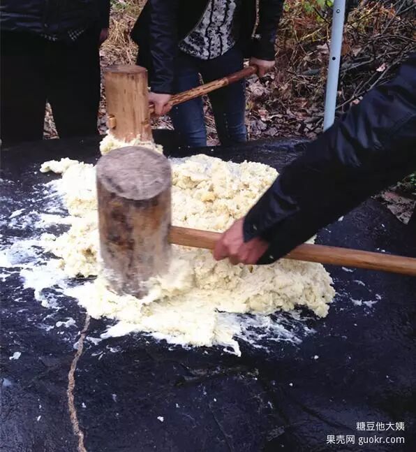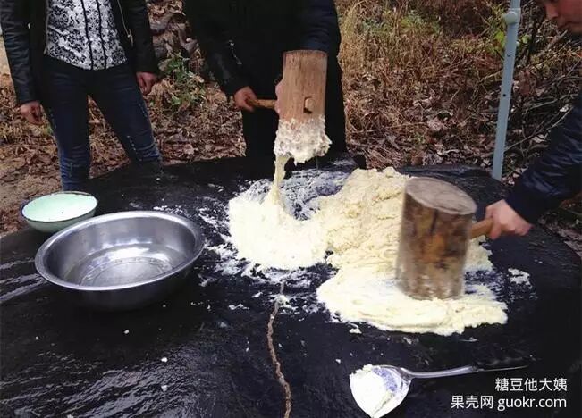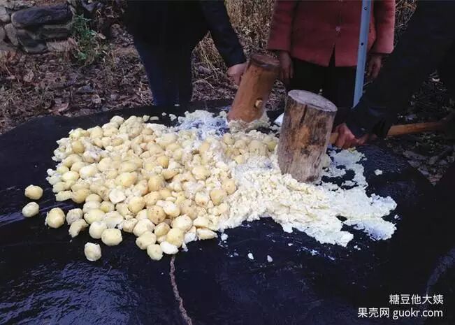 开始的时候先要用锤子慢慢的把洋芋压磨成泥状才好打