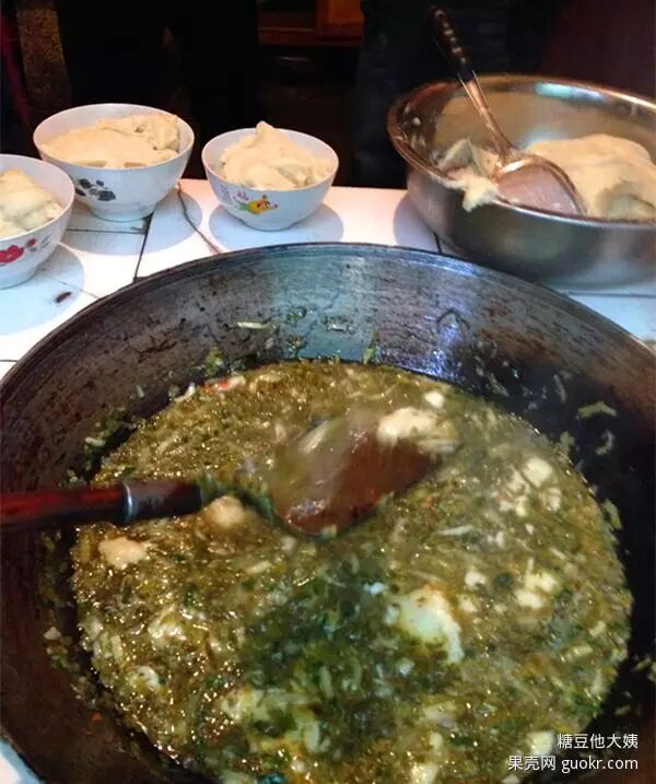 大铁锅里烧好的滚烫的浆水