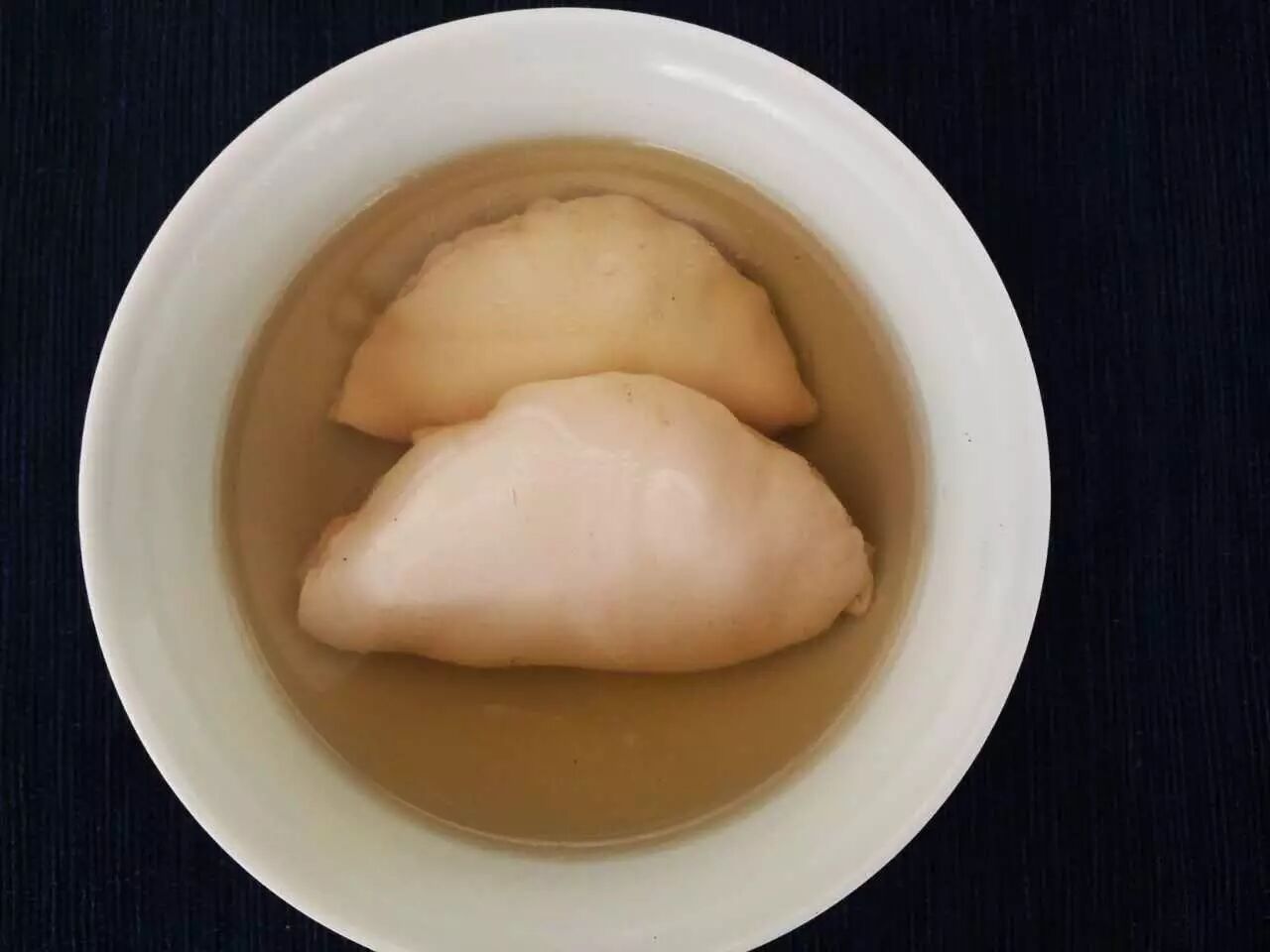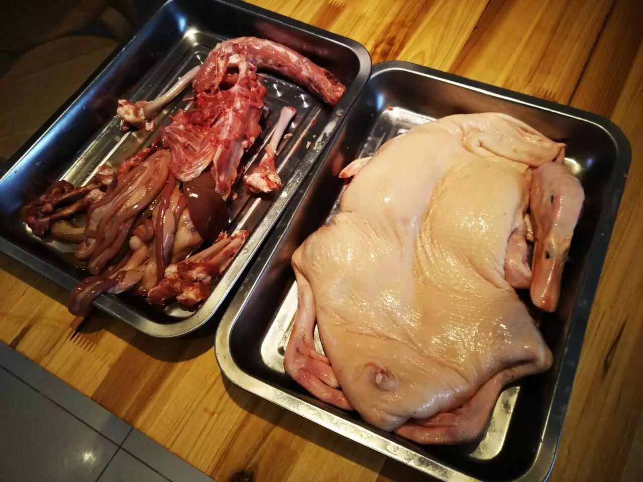 三套鸭,是将鸽子,野鸭,家鸭,分别用整禽脱骨的技法将骨头取出,外形保持完整,然后洗清血污,再将鸽子,野鸭,家鸭依次层层套制,焯水定型,加葱姜,清汤,小火炖至酥烂。成品汤清似水,而味道层层递进富有变化。
