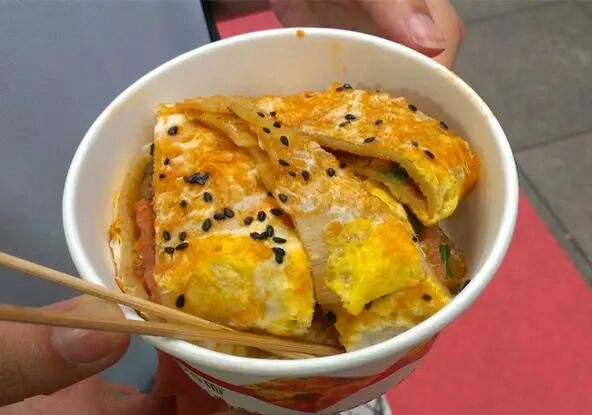一口咬下去,鸡蛋的软滑,冷面的劲道,配上特制的浓郁鲜香的辣酱和佐料,酸甜咸辣四种味道萦绕缠绵在口舌之间,分分钟能填饱肚子顺带心情 high 起来。