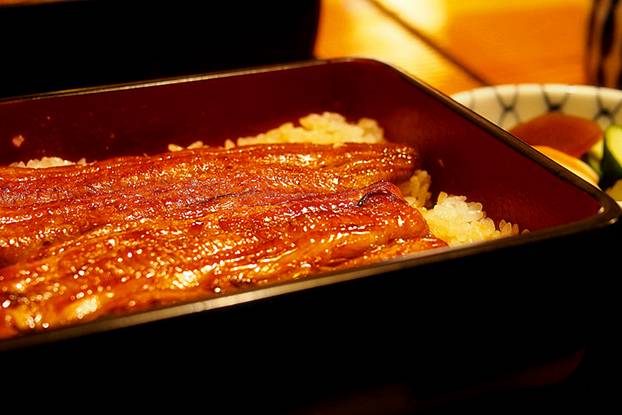 鳗鱼饭的米饭十分讲究。烹制到位的米饭宛如凝脂,既粒粒分明如珍珠一般又要有一定的粘度相互紧紧贴合,使得酱汁在米饭的空隙间缓缓地流淌弥散开来。恰到好处的柔软度能衬托出鳗鱼独特的口感,在口腔中不突兀又不失米粒本性。总之,你的舌尖并不在意它的存在却又离不开它。米粒和酱汁若即若离,交相辉映,闪耀着琥珀般的光泽。
