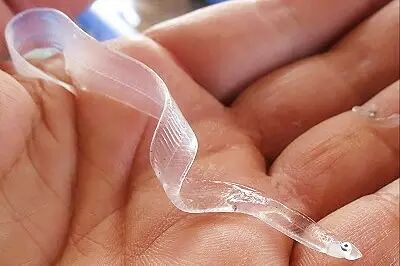 最后介绍的是星鳗的幼鱼也就是星鳗仔,比较小众的食材。它处于星鳗的狭首型幼体(leptocephalus)的变态阶段,通体晶莹剔透,形似柳叶,味道清甜。既可以做成军舰卷寿司,也可以直接蘸酱刺身食用。放开它,人家还是孩子!