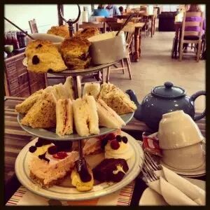 Afternoon tea是一种传统食物,包含三明治,司康饼和蛋糕。现在很多下午茶有马卡龙啊闪电泡芙啊,他们都不算传统的下午茶了。Afternoon tea经常被和High tea混用,但是据说这两个是不同的东西。相传在19世纪的时候,人们晚上8点才吃晚饭,所以在下午4点的时候,会有一个下午茶,来让人们填补一下空虚的胃。下午茶通常是富人们的玩意。而High tea则是穷人们在劳作之后,补充一下体力用的,所以通常是高热量的食物和浓茶。