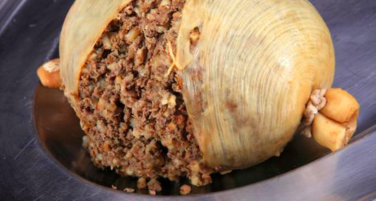 Haggis,做法是先把羊的瘤胃掏空,里面塞进燕麦、羊的内脏(如肝、心、肺、肾)再加上洋葱、动物脂肪油(suet)、牛肉、香料等。然后封好口,拿去煮,煮到鼓胀。