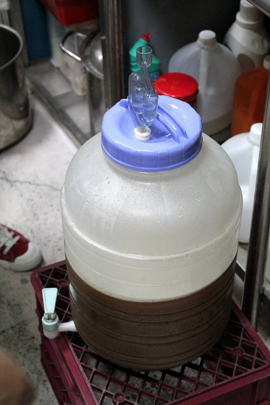 6. 酿造的动作到此就告一段落了,接下来麦汁、啤酒花、酵母和水就这样和乐融融的在发酵桶里一起生活,在经历十多天的发酵后,可以分装到玻璃瓶,再经过一段熟成期便可享用了。