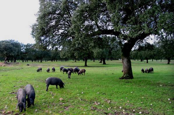 放养,以谷物和橡实为食,并在橡实成熟季节(10月到1月)让猪随意吃橡实,每头猪有至少半公顷橡树林,根据不同产地,所食食物中50-65%是橡实,并且在此期间由本来体重80-105公斤增加到150-180公斤的才能叫Jamón ibérico de bellota。