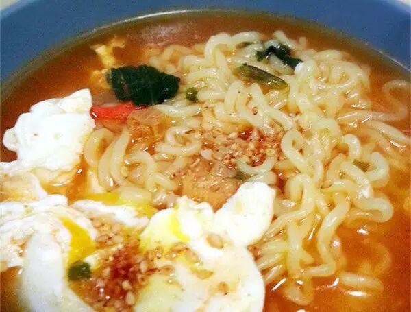 韩国的拉面有个最大的特点就是面饼大,略粗,需要经水煮才软化劲道,而且要煮的时间略长,大概4到5分钟不等。我个人比较偏爱加鸡蛋,也可以临出锅加两滴麻油。韩式嘛~
