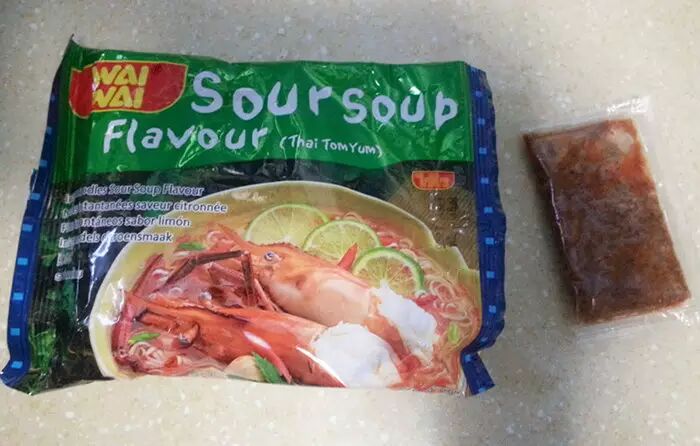 这面的封面太乌龙了,我一直以为也是青咖喱,后来看到sour soup才意识到是酸汤面。包装比较随便,里面就满共就一个汤包。面饼是所有品种里最酥的,而且偏黄,可见过油炸的很猛,煮出来也是油很重。但是,这款的突出特点是,太,酸,了!!!