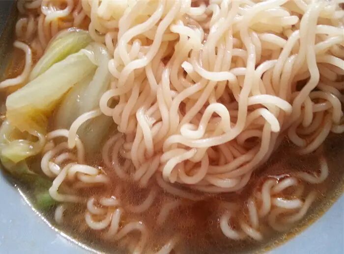 这款封面上标的是辣面,但估计研发还是按照港人的口味,算是清淡的汤面。汤里面有淡淡的海鲜味,但没有猪骨汤面浓厚。味道上真的是毫无辣感,不知道这辣面是从哪里得来的,面依旧好吃,但味道上有点无功无过,充饥总之够了。