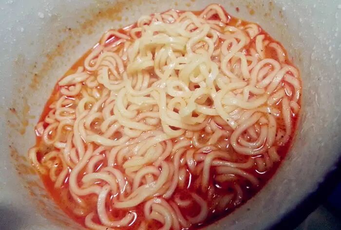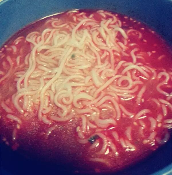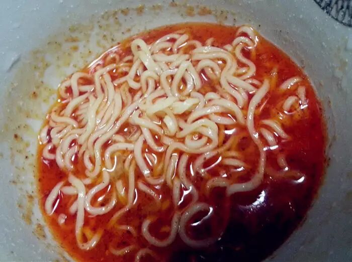 不得不说三养的味道和辛拉面很像,但其实还是有区别。三养好像咸了一点,粉包和辛拉面差不多,很红,但煮出来不辣,甚至汤里有回甘,没有辛拉面的腥味。而且料包里多了香葱!!!细品有点干香的味道,总体来说比辛拉面温和,辣椒比较细,汤喝到最后还没有辣椒粉末的颗粒感。个人感觉比辛拉面好吃,面条能吃出面的透明劲道。