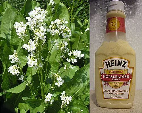 辣根植株照片,以及一瓶没“染过色”的辣根酱