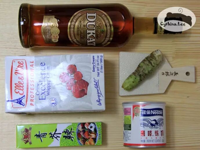 材料超级简单,淡奶、炼乳、白兰地或者其他高度酒,然后就是决定风味的wasabi了,当然也可以换成自己喜欢的任意口味~