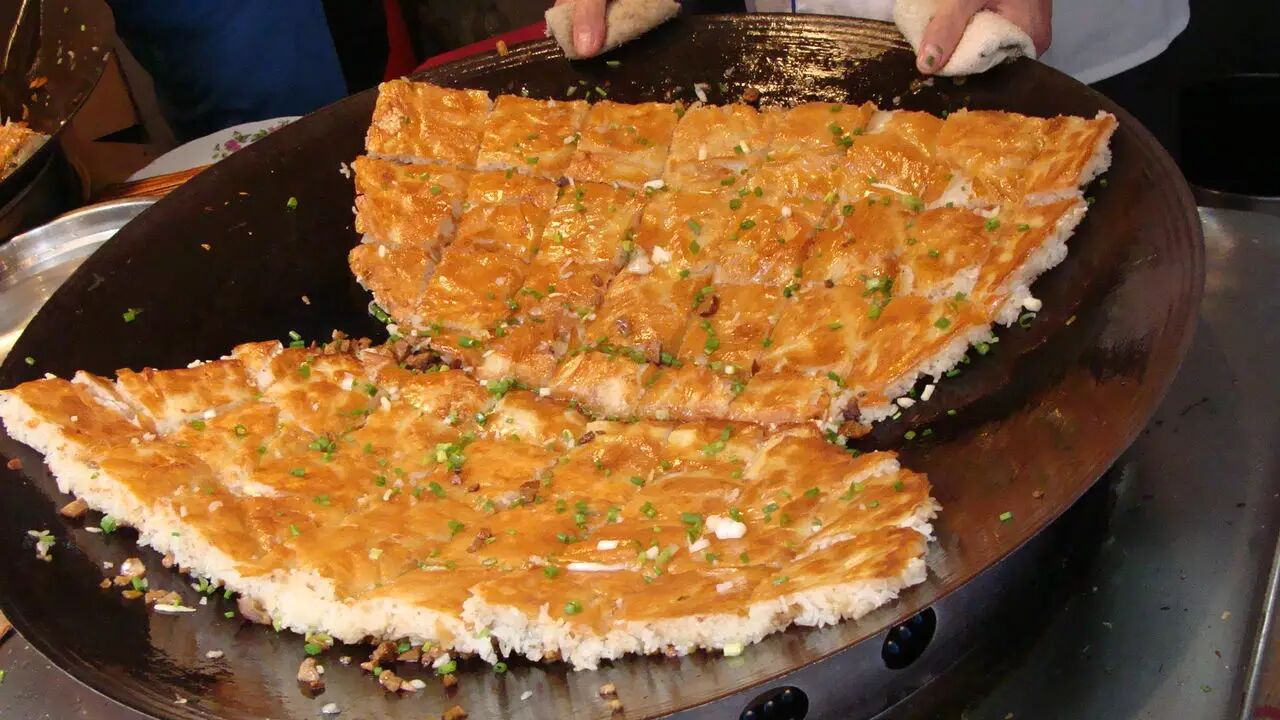 厨师往往会用颠锅这个动作来炫耀自己炒菜的技术。但你见过一口直径一米五的锅该怎么颠么?对于一个做豆皮的师傅来说,这是基本功。在打卤铺好之后,师傅会颠起大锅,给这半成品豆皮翻个面。之后,下油,加热,转动锅子,几分钟之后大手一挥,撒上绿色的小葱葱花,成了!