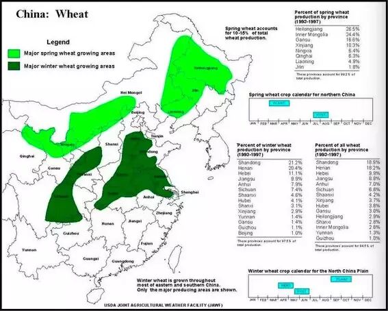 全中国差不多都种植小麦,甚至南至海南岛都有,只不过那里小麦不是主要作物。上图中标出了中国1993-1997年小麦的主要产区。因为地域实在太广,品质差异很大。现代科学对于小麦的研究发现小麦的品种、降水月份、降水量、日照、昼夜温差、病害、土壤、种植方法等等都对小麦的品质有影响。在美国和加拿大,红硬春麦的蛋白质含量最高。中国的春麦产区,则因为气候和土壤的关系,不是所有地区都能适合生产硬麦,也并非所有地区的品质都好,春麦整体蛋白质含量不如北方产的冬麦。 不过仍然有少部分地区的春麦质量非常高,比如自古农业就非常发达的内蒙古的河套平原。