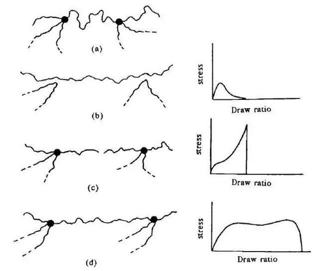 (c)是拉伸的速度特别快,分子被拉得伸展开来,但是却突然断裂,导致虽然表现出的强度很大,却并未拉到最大的长度