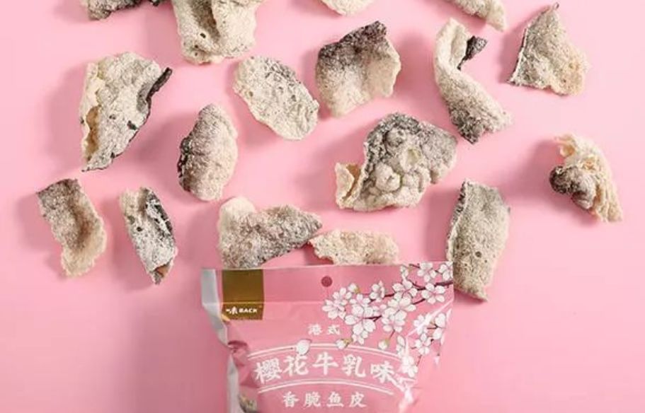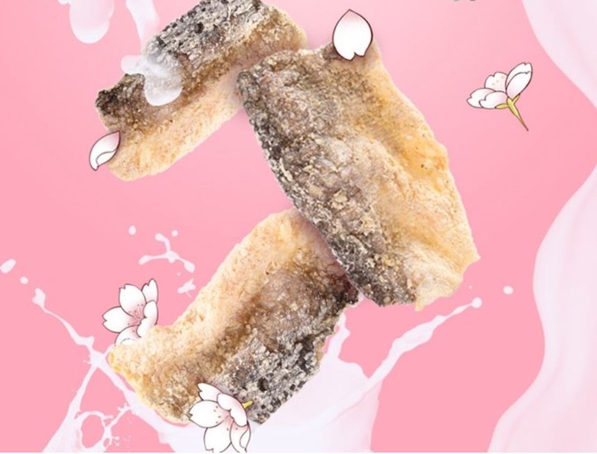 大家还记得之前的网红零食咸蛋黄鱼皮吗?作为炸鱼皮家族中的一员,樱花牛乳味鱼皮继续延用了之前的选材和工艺。原料选用巴沙鱼皮,它的皮下脂肪分布均匀,油炸时脂肪发生的美拉德反应,就是让人难以抗拒的味道。