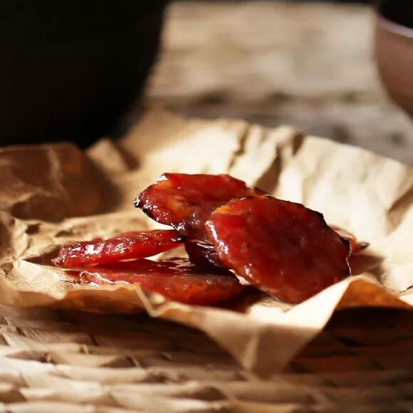 除了各种牛肉干,所长还特别喜欢在郊游的时候带点炭烤猪肉脯。只有糖和鱼露调味的猪肉脯,先经果木炭烤,再放置在特制的竹筐上静置,使得肉干充分融合了炭香、竹香,最后香美诱人。