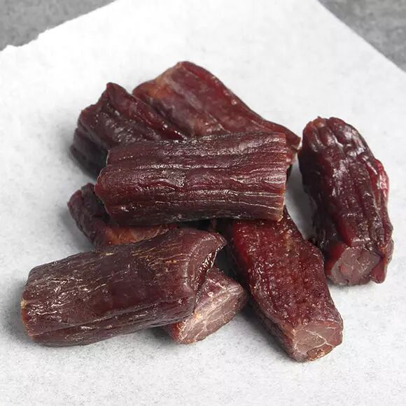 只用一点点盐调味的风干牛肉。肉质紧实,纹理清晰,去筋达99%以上,入口不干不硬有嚼劲。因为只用了一点点盐,还原了本真的肉味,更好吃。