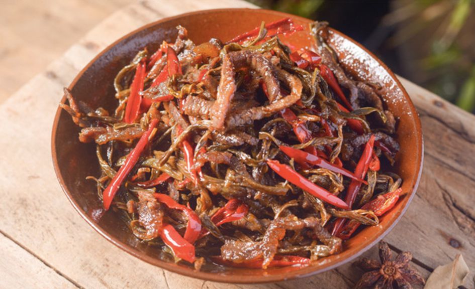 如果觉得风干牛肉不够过瘾,还有辣劲十足的豇豆牛肉。在红彤彤的七星椒、花椒的加持下,极具四川麻辣风味的牛肉丝丝入味,风味独特、回味悠长,唇齿留香。