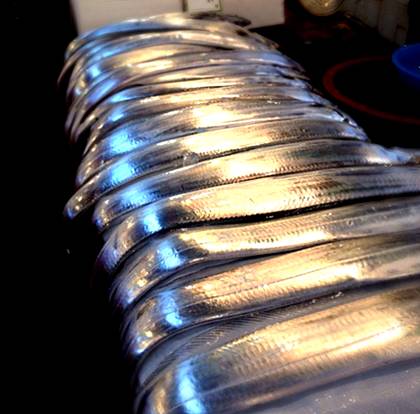 鲜活的带鱼表面有很亮的银光,看起来跟大宝剑一样。