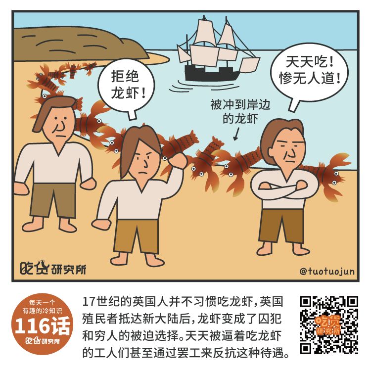 随着殖民者在新大陆势力的扩张,龙虾变成了囚犯和穷人被迫的选择,那些被逼着天天吃龙虾的契约工人们,终于通过罢工和这种惨无人道的行径抗争到底。于是,他们要求在合约里注明,一周吃龙虾的次数,绝对不能超过3次。