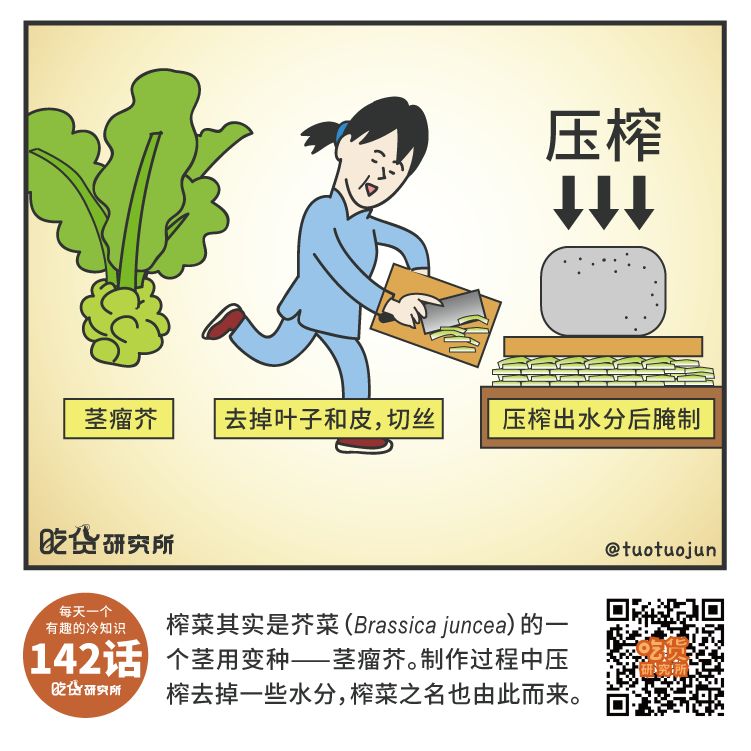 在重庆,制作榨菜时候要先把茎瘤芥的茎略为风干,制作过程中需要压榨去掉一些水分,榨菜之名也是由此而来。而浙江地区在制作榨菜没有风干步骤,而是直接用盐来脱水。