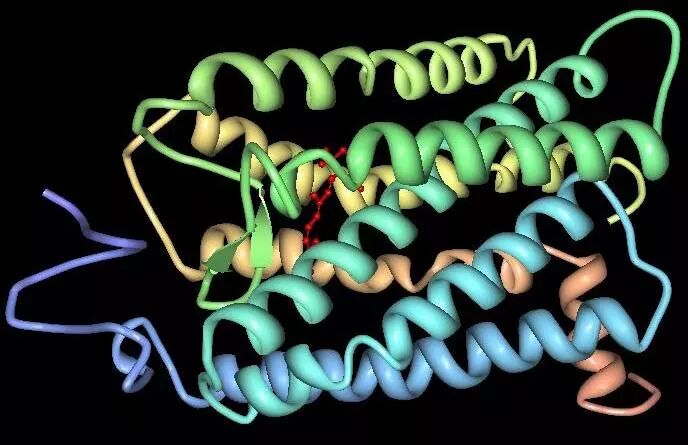 牛的视紫红质蛋白三维结构,注意中间那个红色的小分子就是视黄醛。图片:Palczewski et al. / Science(2000)