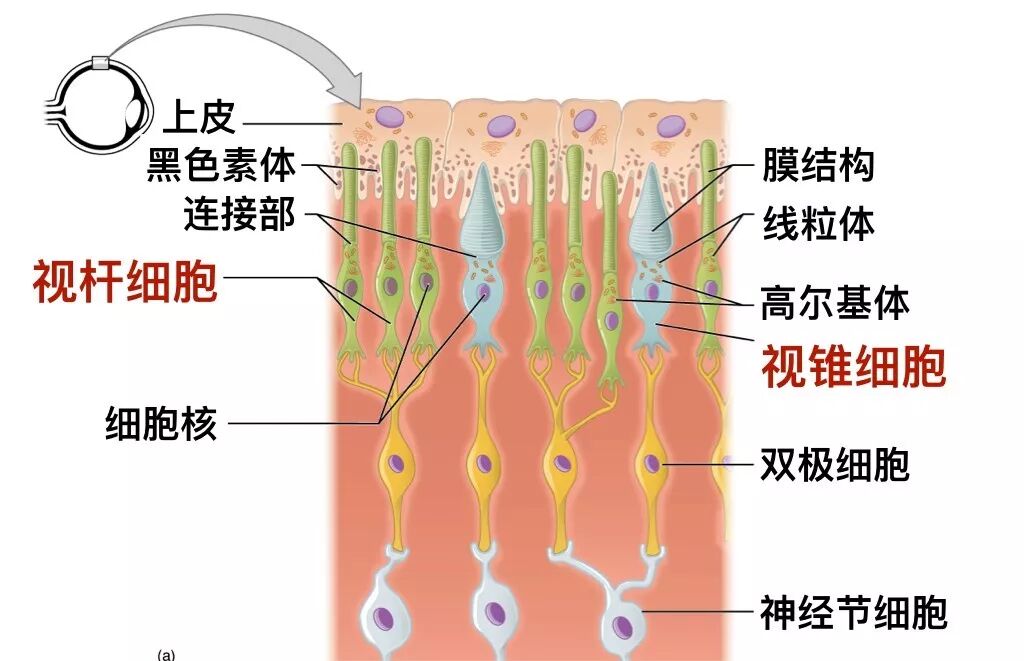 所以,视杆细胞只有一类,主要负责感光,跟分辨颜色没关系;而视锥细胞提供彩色视觉。视锥细胞种类少的物种,能辨别的颜色就少,比如鸟类有四种视锥细胞,而大部分哺乳类只有两种。