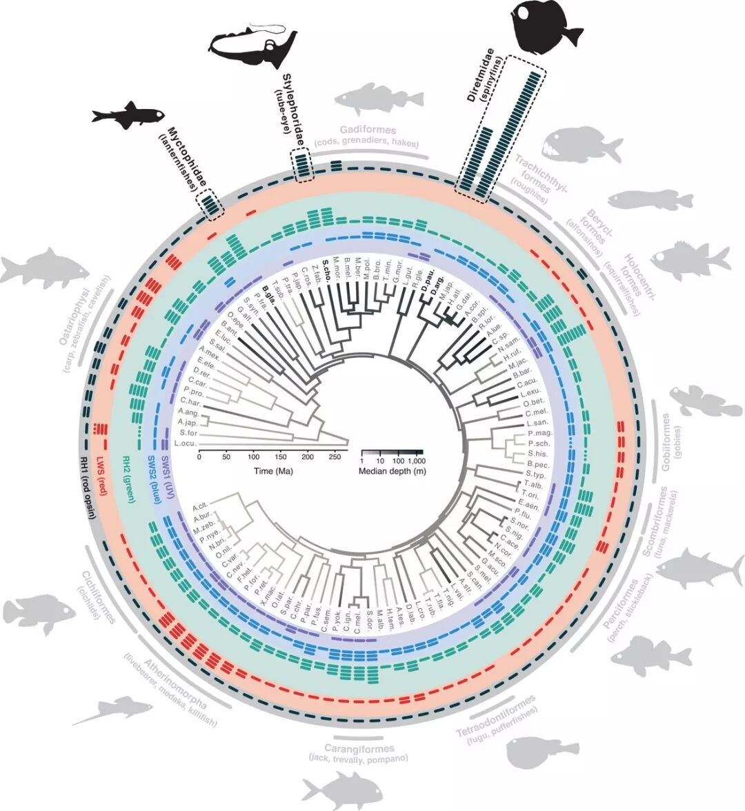 那么,生活在黑暗大洋中的鱼类,它们的视觉系统又有着怎样的适应呢?是经过了“魔改”还是干脆放弃呢?为了弄明白这个问题,来自欧洲和澳大利亚的研究者收集了一百多种鱼的基因组序列数据,其中包括几个生活在深海的物种,想看看这些深海居民的视蛋白基因有没有什么特殊之处。