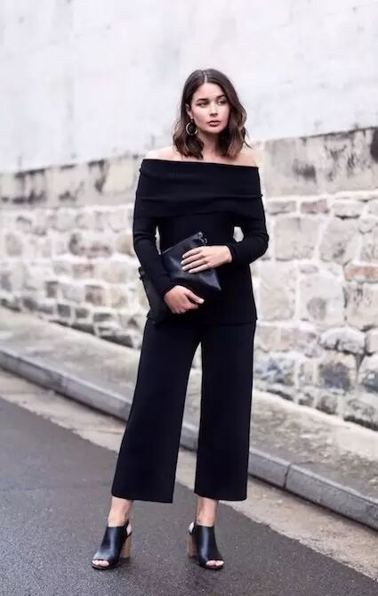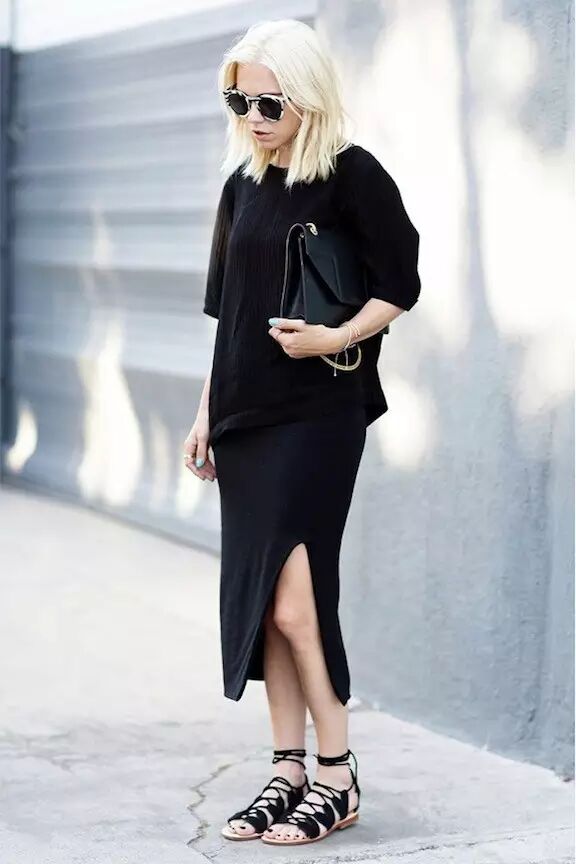 一身全黑的装扮搭配绑带凉鞋,帅气中有一份随意。