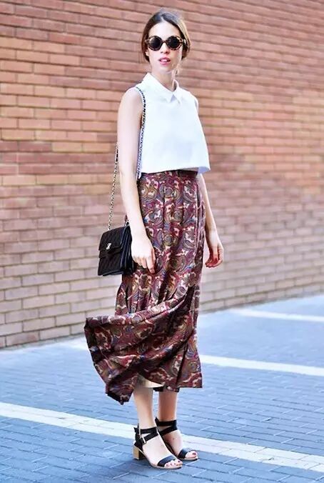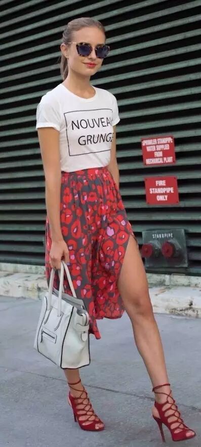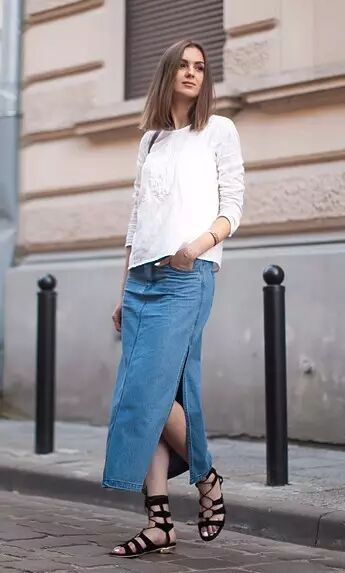 白上衣,长开叉牛仔裙,搭起来挺好看。