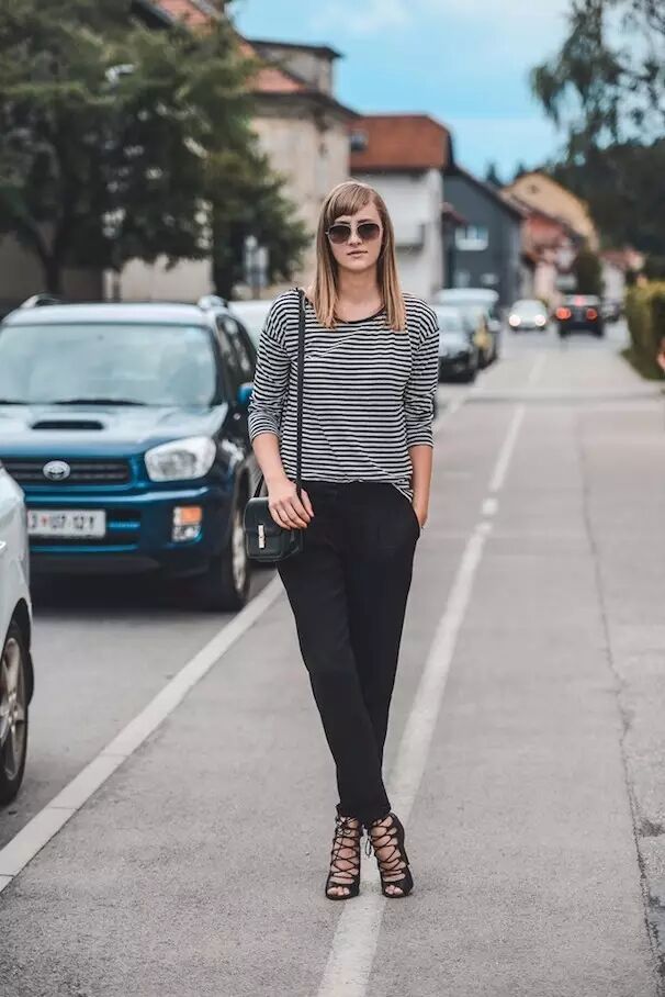 简单休闲的服饰搭配绑带高跟,气场和时髦度都增加,论一双鞋对穿搭风格的影响(想象一下换成普通的船鞋或者休闲运动鞋)。
