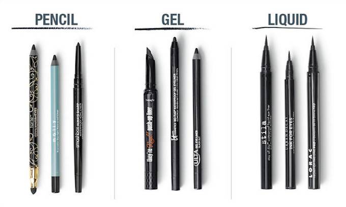 从左至右:眼线笔、眼线胶、眼线液。