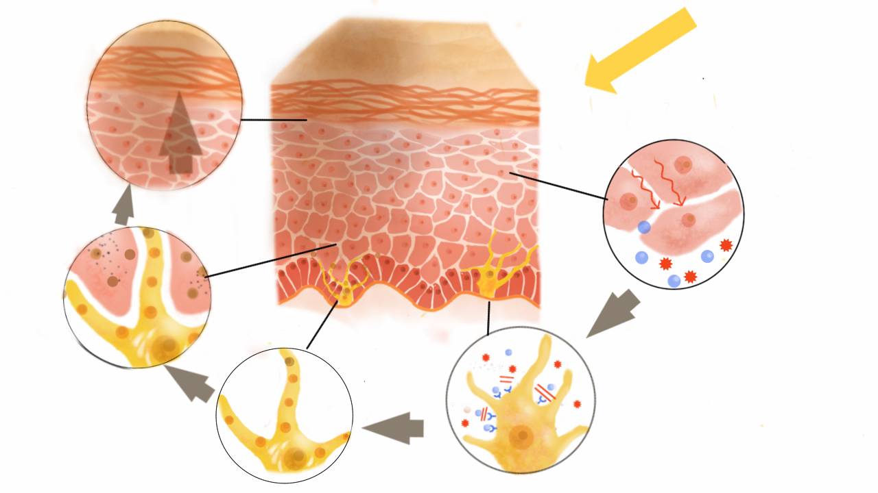 从右至左看,就是皮肤在紫外线诱发下产生更多黑色素、变黑的各个步骤