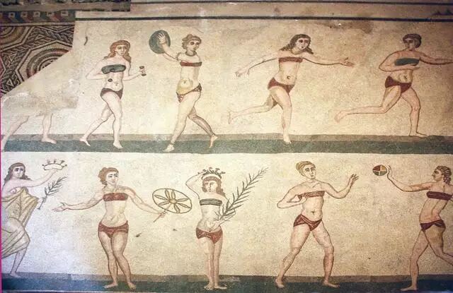 在古罗马,女性用布料和皮革绑住她们的胸部。公元4和5世纪的陶器和马赛克拼贴画中,展示了身着类似比基尼的制服的女运动员。