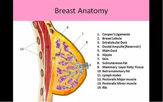 乳房的解剖结构:图中1就是固定胸部的库珀韧带。图片来源:ultrasoundregis
