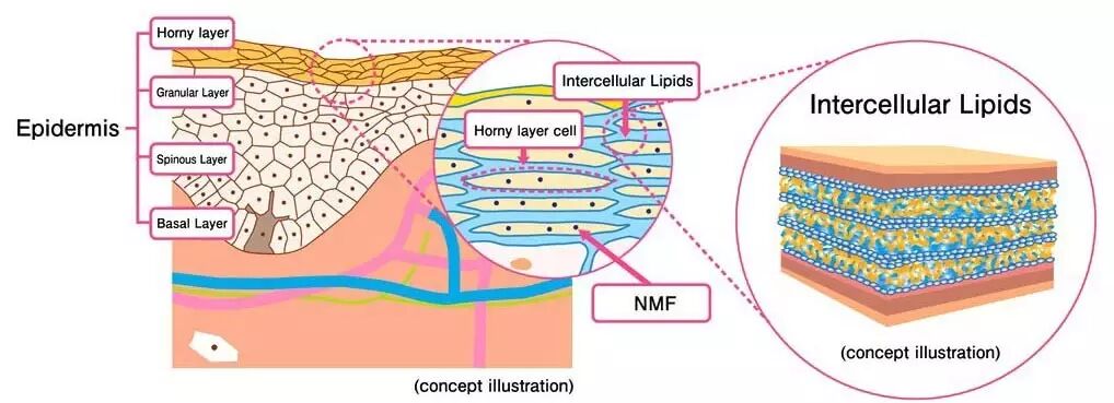 NMF这个东西叫做“天然保湿因子”(Natural Moisturing Factors),是一大堆东西的混合物。人如其名,它们特别能够帮助皮肤保湿,跟水的结合力特别强。