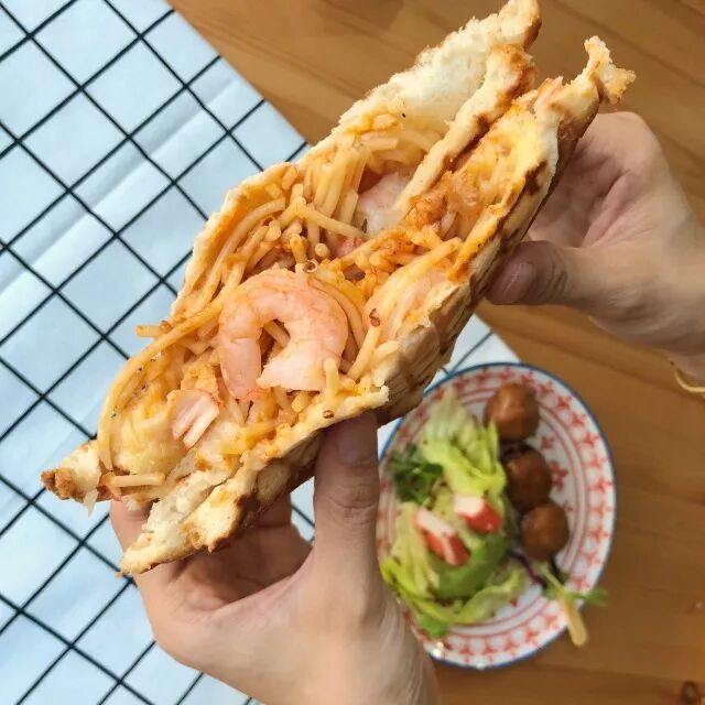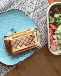等待时,面包麦香逐渐在空气中弥漫,光是闻到这味道就十分满足了。待加热完毕,三明治溢出热气和香味,独特的格纹设计令外皮更加酥脆,内瓤格外松软,吐司紧紧粘合。谷物的醇香混合着饱满丰富的内料,味道简直甩面包店100条街!一口咬下去,还有“咝咝”的酥脆声~